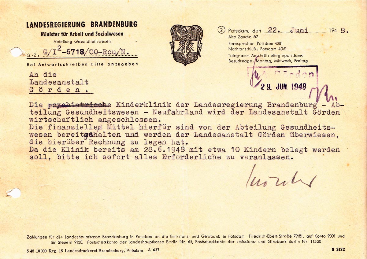 Die (Psychiatrische) Kinderklinik Neufahrland wurde ab Juni 1948